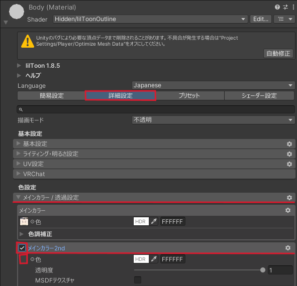 詳細設定を選択、メインカラー/透過設定を開き、メインカラー2nd(3rdでも可)にチェックを入れます。