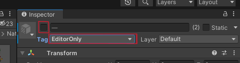 下着メッシュがある場合は、該当メッシュを選択した後にInspectorにてチェックを外し、TagをEditorOnlyに変更してください。